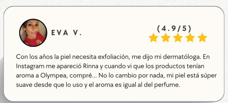 Nuestra crema exfoliante elimina células muertas y limpia profundamente la superficie de la piel, ayudando a destapar poros y mejorar la textura. Reduce la apariencia de granitos corporales, deja la piel más lisa al tacto y potencia cualquier tratamiento que apliques después. Tu piel se ve más pareja, más suave y con el aroma de tu perfume favorito gracias a Rinna.